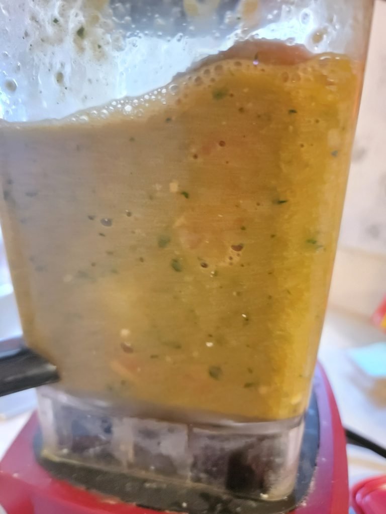 - In the blender you should have everything from the pot that you boiled the vegetables (not the water) and place the cumin, salt, cilantro, and lime juice.